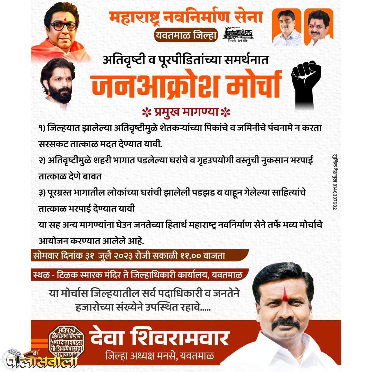 जिल्हाभरात आठवडाभरा पूर्वी झालेल्या ढगफुटी सदृश पावसाने हाहाकार माजवला होता. या झालेल्या अतिवृष्टीमुळे जिल्हयातील नदी नाले धोक्याची पातळी ओलांडत होतें. यापुराच्या पाण्याने शेत जमिनी, माती व पिकांसह खरडून गेल्या त्यामुळे शेतकऱ्यांचे मोठे आर्थिक नुकसान झाले. पुराचे पाणी अनेक गावांमध्ये शिरल्याने घरे पुर्णतः पाण्यामध्ये जाऊन नागरिकांच्या घरातील संसारउपयोगी साहित्याची नासधूस होऊन अनेक कुटुंब उघड्यावर आले. यापुरांचा फटका शेतकरी, सर्वसामान्य नागरिकांसह व्यापाऱ्यांना सुध्दा झाला.तर शहरातील अनेक वाहने या पाण्यात वाहुन गेली. तर दिनांक २७ जुलै रोजी यवतमाळ शहरांतील बांगर नगरात गटाराच्या ड्रेनेज मध्ये पडून एका साठ वर्षीय महिलेचा मृत्यू झाला. या सह अनेक ठिकाणी जीवित हानी झाली. झालेली नुकसानाची पाहाणी मदत व पुनर्वसन मंत्री जिल्हयात आलें. त्यांच्या येण्याने शेतकऱ्यांना व पिडीतांना मदतीची आस लागली होती. मात्र या मंत्र्यांनी जिल्हा मुख्यालयात बसूनच तोकड्या मदतीची घोषणा करून पीडितांच्या तोंडाला पाणे पुसण्याचा प्रकार केला. पूर व अतिवृष्टीग्रास्तांवर झालेल्या या अन्याया विरोधात मनसेने दंड थोपटले असुन जिल्हयात झालेल्या अतिवृष्टीमुळे शेतकऱ्यांच्या पिकांचे व जमिनींचे पंचनामे न करता सरसकट तात्काळ मदत देण्यात यावी, अतिृष्टीमुळे शहरी व ग्रामीण भागात पडलेल्या घरांचे व संसार उपयोगी साहित्यांचे नुकसान भरपाईची तात्काळ देण्यात यावी, पूरग्रस्त भागातील लोकांच्या घराची व वाहुन गेलेल्या साहित्यांची तात्काळ मदत देण्यात यावी, पूरग्रस्त गावांचे तात्काळ पुनर्वसन करण्यात यावे, खरडून गेलेल्या जमिनीचे कामे करण्यात यावे, तसेच नुकसानग्रस्त शेतकऱ्यांना तात्काळ पीक विमा देण्यात यावा अशा मागण्यांना घेऊन उद्या (दिनांक ३१ जुलै) सकाळी ११.०० वाजता महाराष्ट्र नवनिर्माण सेने कडून जिल्हाधिकारी कार्यालयवर जनआक्रोश मोर्चा काढण्यात येणार आहे. या मोर्चाचे नेतृत्व मनसे नेते राजु उंबरकर, जिल्हाध्यक्ष देवा शिवरामवार करणार आहेत. या जन आक्रोश मोर्चास जिल्हयातील सर्व मनसे व मनसे अंगीकृत संघटनांचे पदाधिकारी आणि जिल्ह्यांतील पूरग्रस्त व अतिवृष्टीग्रस्त नागरिकांनी उपस्थित राहण्याचे आवाहन पक्षाच्या वतीने करण्यात येत आहे.