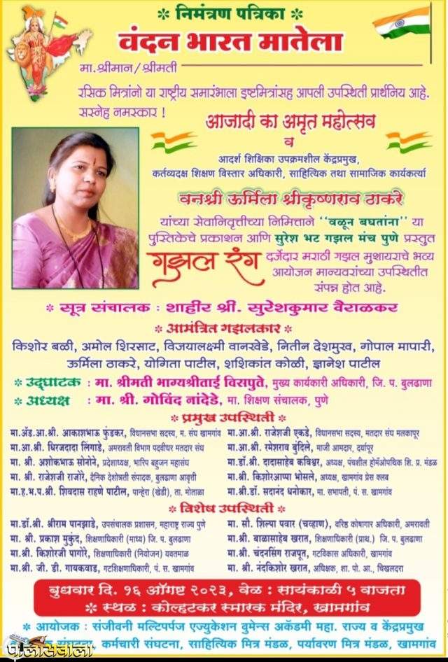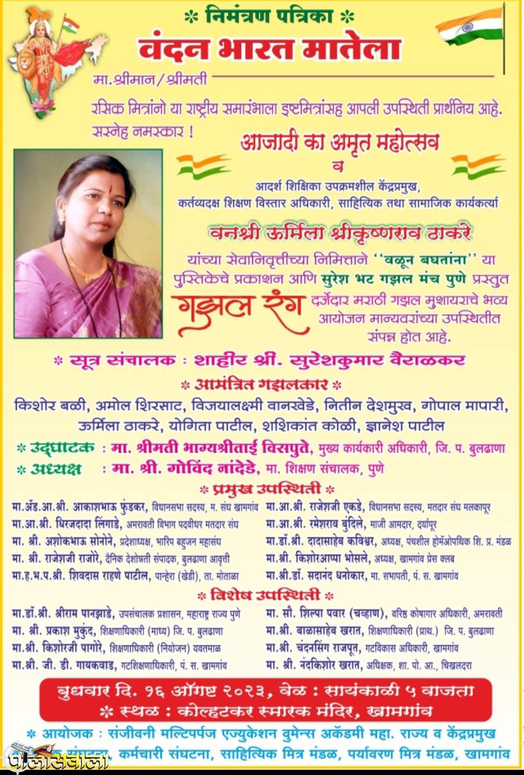 *बुधवार,दिनांक १६ ऑगस्ट २०२३ रोजी, वेळ* *सायंकाळी ५ वाजता कोल्हटकर स्मारक मंदिर,खामगाव येथे आजादी का अमृत महोत्सव निमित्ताने वृक्षारोपण व आदर्श शिक्षिका,उपक्रमशील केंद्रप्रमुख,कर्तव्यदक्ष शिक्षण विस्तार अधिकारी,साहित्यिक*