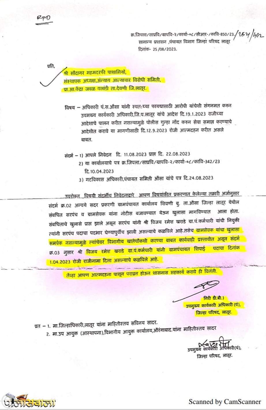 लातूर प्रतिनिधि – ग्रामसेवकची विभागीय खाते चौकशी करण्याचे प्रस्ताव अन्याय अत्याचार भ्रष्टाचार विरोधी समितीच्या तक्रारीला यश!औसा प्रतिनिधी: ग्रामपंचायत शिवणी (बु.) ता.औसा जि.लातूर येथील संबंधित ग्राम विकास अधिकारी यांनी संगणमत करून स्वतःच्या फायद्यासाठी वर्तमानपत्रात शिपाई पद भरती जाहिरात न देता संगणमत करून दि.1/2/2021 रोजी नामे विजय रमेश खराडे यांची खोटी नियुक्ती दाखवून ग्रामपंचायतच्या प्रोसिडिंग बुक मध्ये प्रत्येक पानावर 2021 हा इ.स.वी.सन खाडाखोड करून सन 2021 ऐवजी 2019 खाडाखोड करून प्रोसिडिंग रजिस्टरच्या पानांमध्ये बदल करून खोटे ठराव दाखवून व सदर खोट्या ठरावावर संगणमत करून सदस्यांची सही घेऊन खोट्या ठरावा आधारे खोटी नियुत्ती दाखवून शासनाची फसवणूक व भ्रष्टाचार केल्याची तक्रार अन्याय अत्याचार भ्रष्टाचार विरोधी समितीचे संस्थापक अध्यक्ष सौदागर महमदरफी यांनी दि.1आक्टोंबर 2021 रोजी गटविकास अधिकारी पंचायत समिती औसा येथे व वरिष्ठ कार्यालयाकडे अनेक वेळा तक्रार दिल्याने त्याची दखल घेऊन दि.19/01/ 2023 रोजी उपमुख्य कार्यकारी अधिकारी पंचायत जिल्हा परिषद लातूर यांनी असे निर्णय दिले की एकंदरीत ग्रामपंचायत कर्मचारी रमेश खराडे यांची ग्रामपंचायत शिपाई पदासाठी केलेली नियुक्ती ही बनावट दिसून येते ग्रामपंचायत कर्मचारी यांची नियुक्ती करत असताना ग्रामपंचायत कार्यालय शिवणी बु. यांनी अधिनियमातील तरतुदीचे पालन न करता बनावट नियुक्ती केल्याचे सिद्ध होत आहे याबाबतीत सरपंच श्रीमती शोभा धोंडीराम जाधव व ग्रामसेवक निरुडे एस.व्ही. यांना जबाबदार ठरविले असताना देखील बोगस शिपाई यांना नोकरीवरून पदमुक्त करण्यात आले नव्हते त्यामुळे दि.23/3/2023 रोजी ईमेल द्वारे गटविकास अधिकारी पंचायत समिती औसा व मुख्य कार्यकारी अधिकारी जिल्हा परिषद लातूर यांना तक्रार दिले होते की गटविकास अधिकारी औसा यांनी स्वतःच्या फायद्यासाठी आरोपीशी संगणमत करून उपमुख्य कार्यकारी अधिकारी जि.प. लातूर यांच्या आदेशाचे पालन करीत नसल्याने गटविकास अधिकारी यांच्या विरोधात पोलीस सामार्फत गुन्हा नोंद करण्यात यावी अशी तक्रार दिल्याने त्या तक्रारीनुसार दि.1/4/2023 रोजी बनावट शिपाई विजय खराडे यांचा राजीनामा घेतला असून संबंधित सरपंच व ग्रामसेवक यांना नोटीस बजावून खुलासा मागविण्यात आला होता ग्रामसेवक यांचा खुलासा संपर्क नसल्यामुळे त्यांच्यावर विभागीय खाते चौकशी करण्याबाबत कारवाई प्रस्तावित आहे एकंदरीत अन्याय अत्याचार भ्रष्टाचार विरोधी समितीचे संस्थापक अध्यक्ष सौदागर महमदरफी यांनी वारंवार तक्रार, उपोषण, आंदोलन करून त्याचा पाठपुरावा केल्याने अखेर बनावट शिपाई रमेश खराडे यांचा राजीनामा घेण्यात आला.