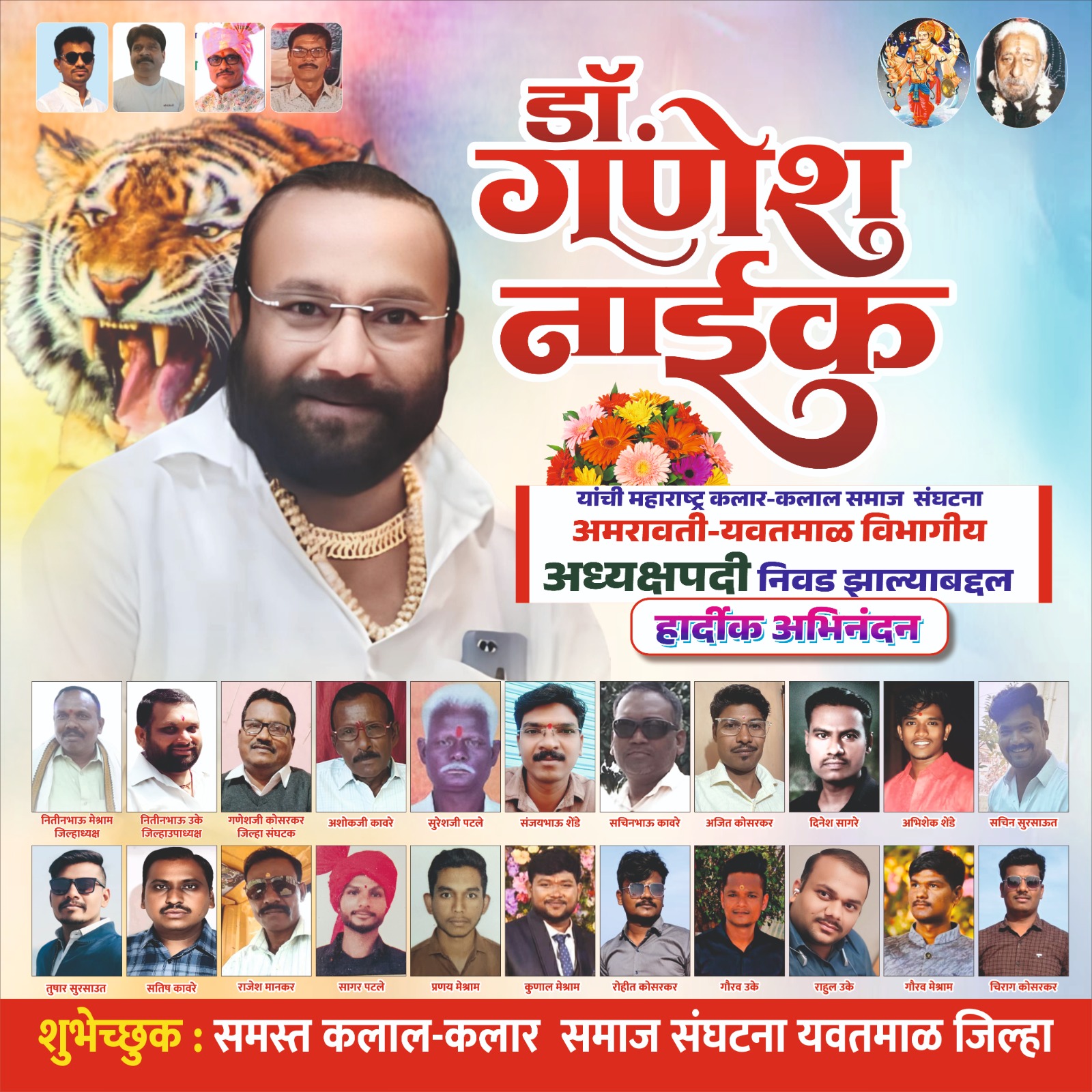 यवतमाळ व अमरावती विभागात महाराष्ट्र कलार-कलाल समाज संघटनेच्या विविध पदांवर नव्या पदाधिकाऱ्यांची नियुक्ती करण्यात आली आहे. माननीय सागरभाऊ समुद्रवार, रवींद्र हटवार व कंबरवार साहेब यांच्या नेतृत्वात डॉक्टर गणेश नाईक यांची यवतमाळ-अमरावती विभागीय अध्यक्ष पदी निवड करण्यात आली आहे.