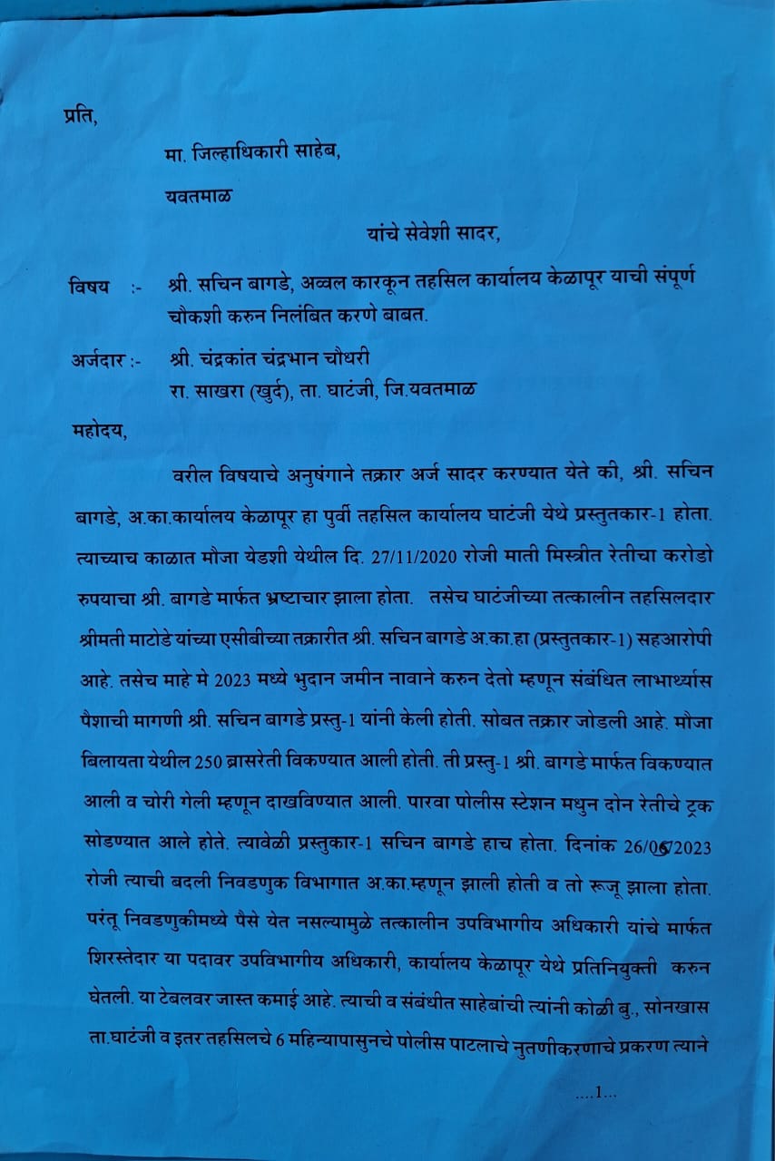 सविस्तर वृत्त असे की, सचिन बागडे अव्वल कारकून, केळापूर येथे सध्या कर्तव्यावर असून गेल्या वर्षभरापासून अनेक भ्रष्टाचारात सहभागी असल्याच्या तक्रारी त्यांच्यावर झालेल्या असून आजपर्यंत कोणतीही ठोस कारवाई त्यांच्या विरोधात केल्या गेलेली नाही.