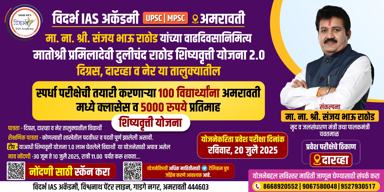 ही योजना ना. संजय राठोड यांच्या वाढदिवसानिमित्त २०२४ मध्ये सुरू करण्यात आली. स्पर्धा परीक्षा क्षेत्रात वाटचाल करू इच्छिणाऱ्या ग्रामीण विद्यार्थ्यांना आर्थिक आणि शैक्षणिक आधार देणे हे यामागील प्रमुख उद्दिष्ट आहे. या योजनेतून एमपीएससी, यूपीएससी आणि इतर स्पर्धा परीक्षांची तयारी करणाऱ्या १०० विद्यार्थ्यांची निवड केली जाणार आहे. निवड झालेल्या विद्यार्थ्यांना अमरावतीतील विदर्भ आयएएस अकॅडमी येथे मोफत मार्गदर्शन प्रशिक्षण दिले जाणार असून, त्यासोबत दरमहा पाच हजार रुपयांचे विद्यावेतन देखील दिले जाईल. या योजनेच्या पहिल्या टप्प्यातून 20 हून अधिक विद्यार्थ्यांची विविध शासकीय पदांवर निवड झाली आहे. मातोश्री प्रमिलादेवी दुलीचंद राठोड शिष्यवृत्तीमुळे ग्रामीण भागातील विद्यार्थ्यांना मोठी संधी मिळाल्याचे चित्र आहे.
