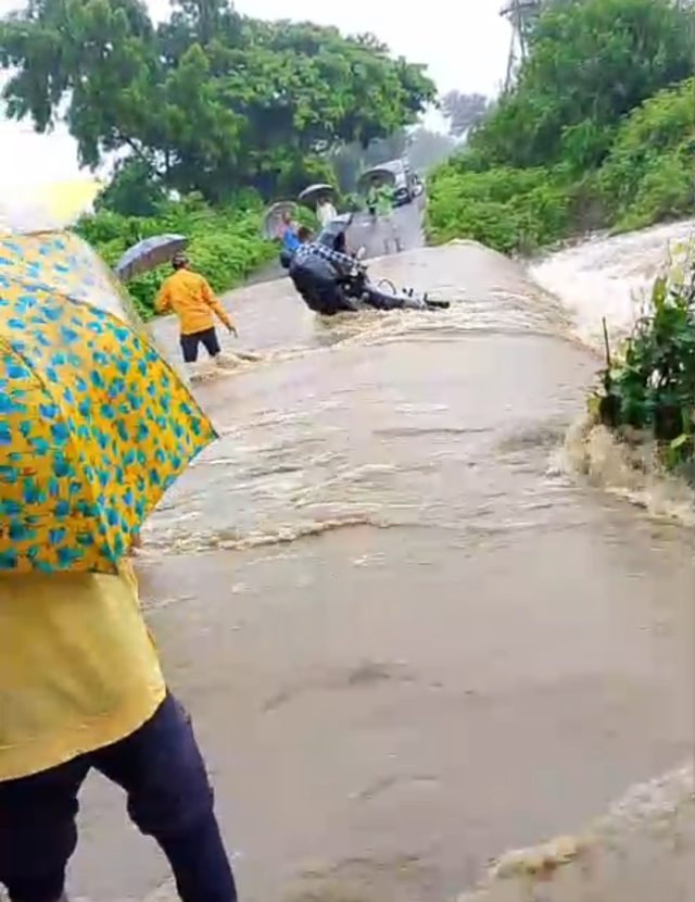 पुराच्या पाण्यात मोटर सायकल सह वाहून जात असलेल्या शिक्षकाला दोन युवकांनी वाचविले ,