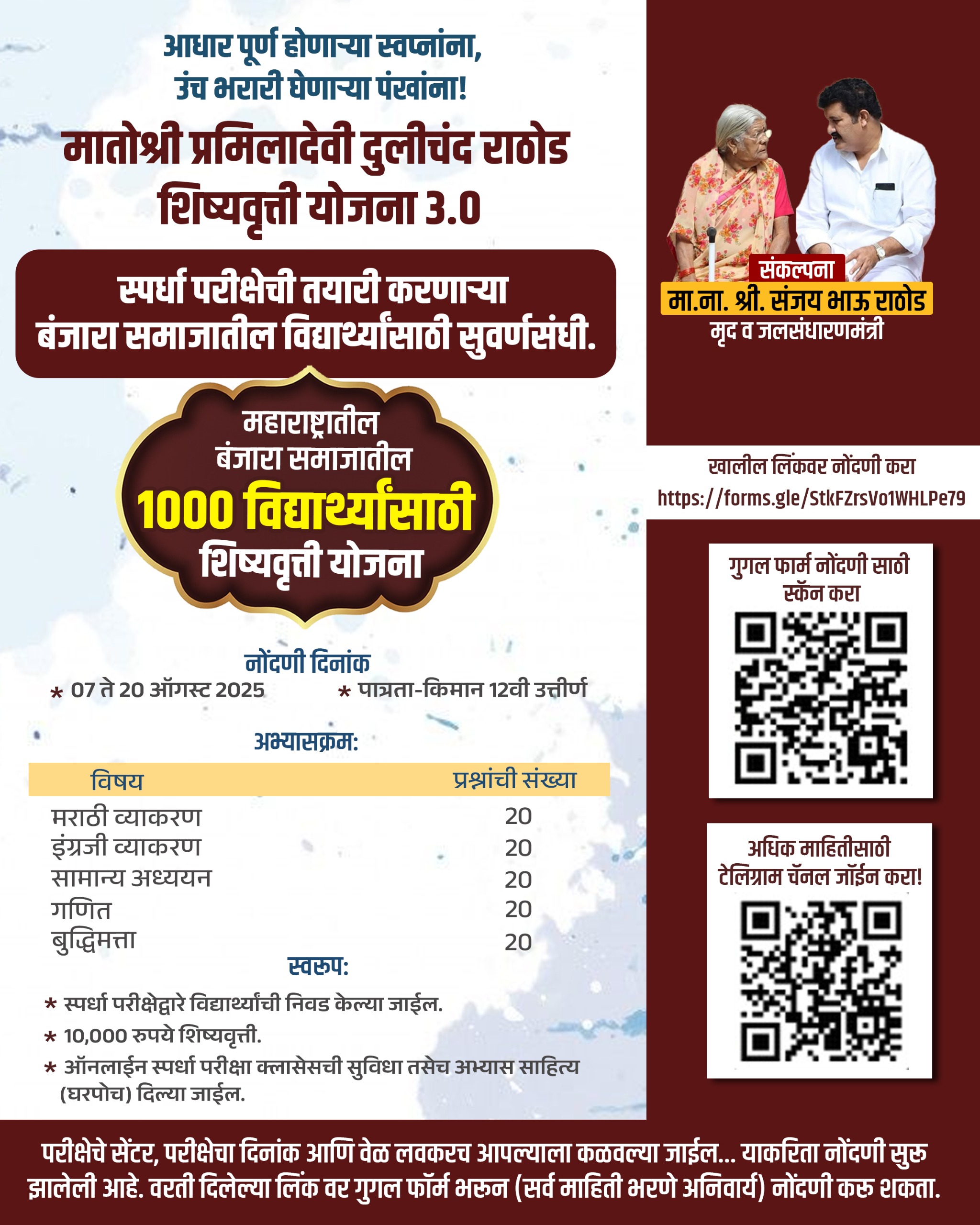 यवतमाळ : महाराष्ट्रातील बंजारा समाजातील स्पर्धा परीक्षेची तयारी करणाऱ्या विद्यार्थ्यांसाठी सुवर्णसंधी उपलब्ध झाली आहे. राज्याचे मृद व जलसंधारण मंत्री संजय राठोड यांच्या संकल्पनेतून ‘मातोश्री प्रमिलादेवी दुलीचंद राठोड शिष्यवृत्ती योजना ३.०’ जाहीर करण्यात आली आहे. या योजनेअंतर्गत राज्यातील एक हजार विद्यार्थ्यांची निवड करून त्यांना प्रत्येकी १० हजार रुपयांची शिष्यवृत्ती दिली जाणार आहे.