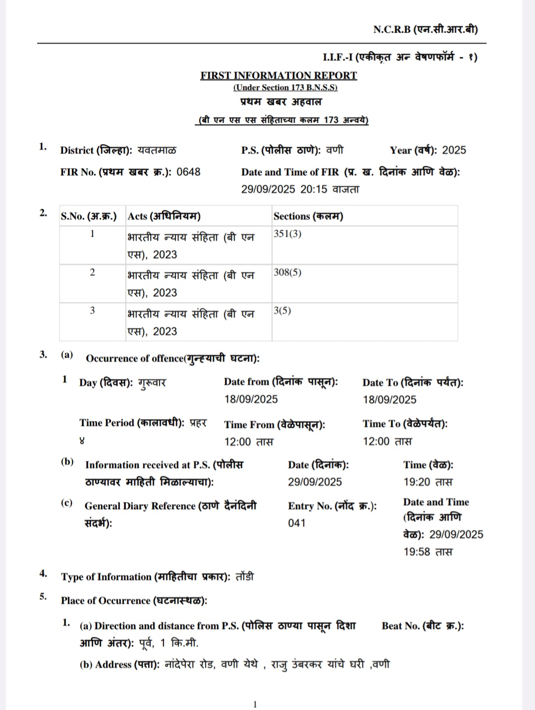 शिकायतकर्ता ठेकेदार का नाम योगेश जयंत ममीदवार (निवासी चंद्रपुर) है। 17 सितंबर को राजू उंबरकर और उनके कुछ पदाधिकारी घोंसा में सड़क निर्माण कार्य स्थल पर गए और वहां मौजूद प्रबंधक अजय हिंगणे, निरपेंद्र पटेल, सागर तनेरवार, कुलदीप पांडे, आकाश उइके को धमकाया और मारपीट की। इससे पहले वणी पुलिस स्टेशन में राजू उंबरकर और उनके पदाधिकारियों के खिलाफ विभिन्न धाराओं में मामले दर्ज किए गए थे।