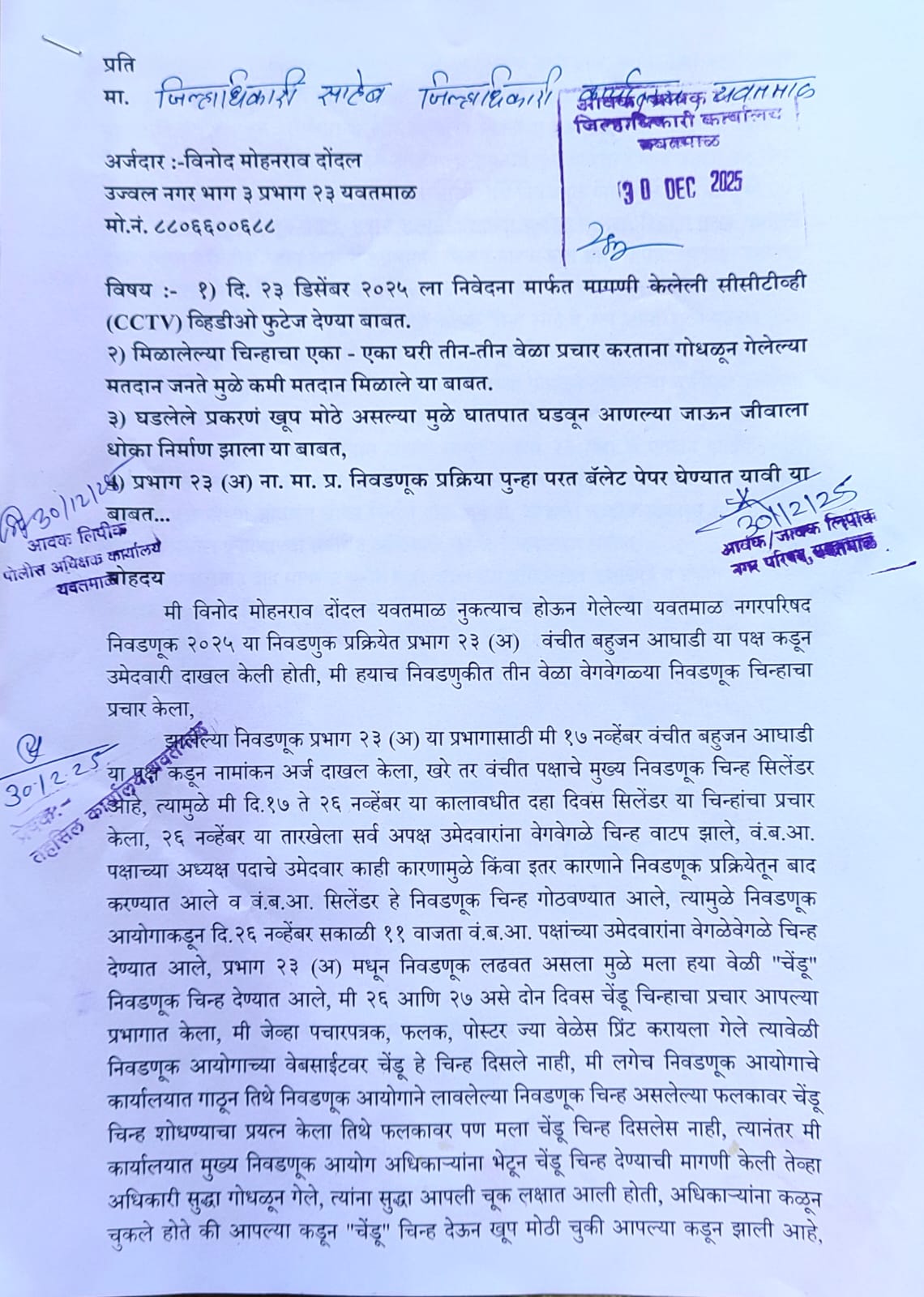 हयाच हलगर्जीपणाच्या कारणामुळे विनोद दोंदल यांना निवडुन प्रचार करताना एका – एका घरी तीन – तीन वेळा सर्व प्रभागात फिरून नाहक त्रास सहन करावा लागले, प्रभागात फिरताना त्यांना अनेक ठिकाणी अडचणीचा सामना करावा लागला, प्रभाग २३ मधील मतदान जनता विनोद दोंदल याला म्हणायची पहिले तू तुझे ठरवून ये की तुझे कोणते चिन्ह आहे ते, मग आम्ही मतदान तुला मतदान करू, मतदान जनता सुद्धा भ्रमिष्ट झाली होती की विनोद दोंदल यांचे निवडणूक चिन्ह “सिलेंडर”, “चेंडू” की “फुटबॉल” हया पैकी कोणते आहे म्हणून, याच निवडणूक आयोगाच्या गोधळून टाकणाऱ्या चुकीमुळे कदाचित विनोद दोंदल यांना मिळालेले मतदान खूप कमी आहे असा दावा विनोद दोंदल यांनी केला आहे. त्यामुळे प्रभागा २३ (अ) चे मतदान प्रक्रिया बॅलेट पेपरवर परत घेण्यात यावी अशी मागणी त्यांनी जिल्हाधिकारी साहेब, मुख्य निवडणूक आयोग मुबई, मुख निवडणूक आयोग दिल्ली इथे पत्र देऊन मागणी केली आहे, घडलेले प्रकरण खूपच मोठे असल्यामुळे विनोद दोंदल यांच्या जीवाला धोका निर्माण होऊ शकतो असे त्यांनी अर्जात नमूद केले आहे, जीवाला काही कमीजास्त झाल्यास सर्व प्रशासना मधील प्रकरणाच्या संबंधित अधिकारी, कर्मचारी जवाबदार राहील असे त्यांनी सांगितले आहे, न्यायालयात दाद मागण्या करीत मला सर्व प्रक्रियेत कागदपत्रे व प्रभाग २३ मतदान केंद्रातील दि.२० डिसेंबर सकाळी ८ ते ११ हया वेळेतील सीसीटीव्ही (cctv) व्हिडीओ फुटेज तातडीने मिळवून देण्यात यावी, जनेकरून न्यायालयात धाव घेत येईल अशी मागणी त्यांनी केली, जर या प्रकरण्यात न्याय नाही मिळाल्यास विनोद दोंदल शांततामय मार्गाने आंदोलन करणार अशी चेतावणी लिखित स्वरूपात निवेदना द्वारे देण्यात आली.