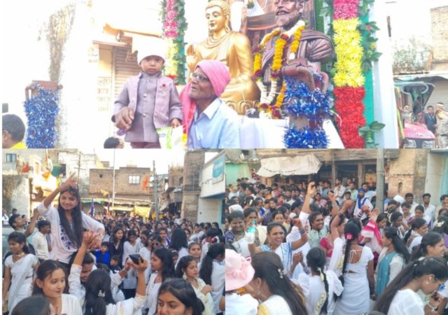 त्यानंतर दुपारी तीन वाजता भीमनगरातून वाजत-गाजत मिरवणूक काढण्यात आली. एका रथावर भारतरत्न डॉ. बाबासाहेब आंबेडकर व महात्मा ज्योतिबा फुले यांच्या मूर्ती, तर दुसऱ्या रथावर तथागत गौतम बुद्ध व छत्रपती शिवाजी महाराज यांच्या मूर्ती ठेवण्यात आल्या होत्या. प्रत्येक चौकात पुष्पवृष्टी करण्यात आली. ग्रामपंचायतीच्या वतीने सरपंच पती अमित जाधव व ग्रामपंचायत सदस्य इब्राहिम शहा यांनी पुष्पवृष्टी केली, तर गुजरी चौकात मुस्लिम समाजाच्या वतीने शरबत वाटप करण्यात आले.त्या नंतर गुजरी चौकात चला चला मेरे ताज का संदल ही कव्वाली वाज्विन्यात आली मिरवणुकीत मुलींच्या लेझीम व टिपरी नृत्याने विशेष आकर्षण वेधले. मोठ्या संख्येने समाजबांधव व महिला सहभागी झाल्या होत्या. या कार्यक्रमाचे आयोजन उत्सव समितीचे अध्यक्ष आकाश गवई, समाजभूषण माजी सैनिक अर्जुन गवई, दादाराव गवई, माजी सरपंच कमलाकर गवई, संदीप खिल्लारे यांसह युवकांनी केले.