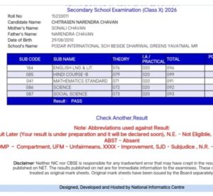 दहावीच्या निकालात ( CBSE ) चित्रसेन सोनाली नरेंद्र चव्हाण ची उल्लेखनीय कामगिरी